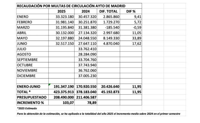 En términos absolutos, el Ayuntamiento ingresará 214 millones de euros adicionales sobre los 208 millones que él mismo había previsto, una desviación difícilmente explicable si no se asume que la maquinaria sancionadora se ha convertido en un recurso estructural de financiación municipal. Analizando los datos mes a mes, en 2025 (hasta junio) se ha verificado una recaudación media del 12% a la registrada en el mismo periodo de 2024.