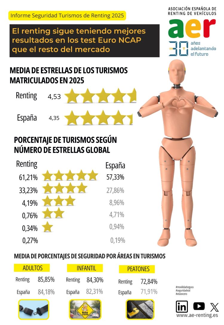 La Asociación Española de Renting de Vehículos (AER) ha publicado hoy el informe de los resultados en los test Euro NCAP de los turismos nuevos matriculados por el renting en 2025.