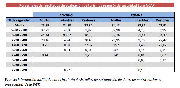 Si se homologan los resultados obtenidos por los turismos evaluados según los criterios de porcentajes de seguridad a estrellas, se obtiene que, de media, los vehículos de renting tienen 4,53 estrellas, sobre cinco, frente a las 4,35, que tienen los turismos matriculados en el total de España.