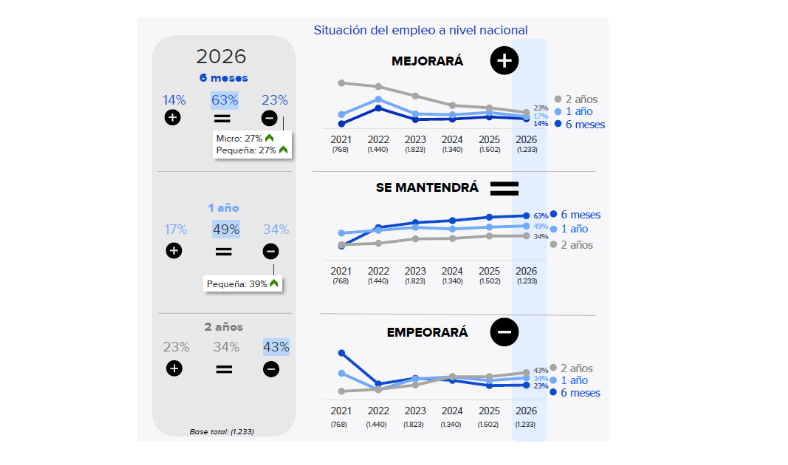 Además, esta valoración varía por tamaño: en el corto plazo, las micro y las pequeñas empresas muestran una mayor inclinación a anticipar un empeoramiento del empleo nacional (27% en ambos casos), cuatro puntos porcentuales por encima del conjunto de las compañías.