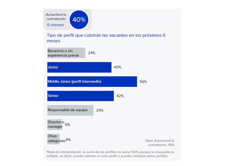 Entre las empresas que prevén contratar en los próximos seis meses, se aprecia que la capacidad de gestión y la experiencia previa de los perfiles intermedios son muy valoradas, ya que estos concentran la mayor intención de incorporación: el 56% afirma que cubrirá posiciones de este nivel. A continuación, destacan los perfiles sénior con un 42% y los júnior con un 40%.