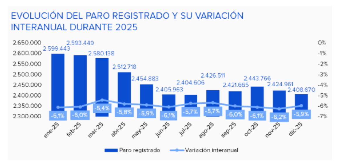 España cerró 2025 con 2.408.670 personas desempleadas. El Ministerio de Trabajo ha hecho público hoy este dato, que muestra un descenso del paro registrado con respecto a noviembre de 16.291 personas (-0,7 %). La comparativa con el cierre de 2024 arroja una reducción del 6 %, lo que supone que ahora hay 152.048 personas en desempleo menos que hace un año.