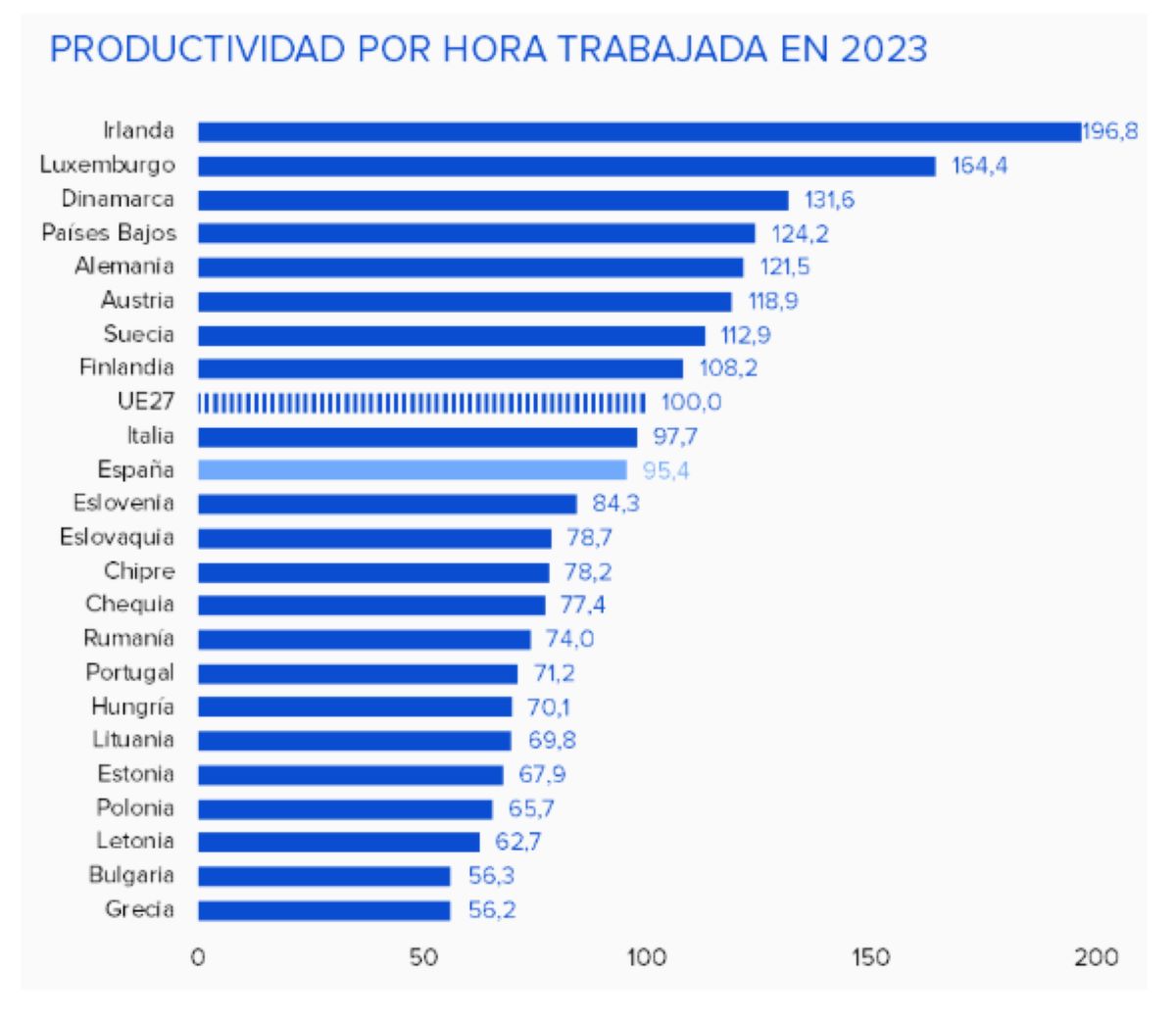 Según los datos de Eurostat, al cierre de 2023 (los más recientes disponibles), la productividad por hora trabajada en España se sitúa en el 95,4 %, tomando como referencia el 100 %, que es el promedio europeo. El registro nacional está, de esta manera, por debajo de la productividad comunitaria. Asimismo, queda lejos de los países que más destacan: Irlanda (196,8 %), Luxemburgo (164,4 %) y Dinamarca (131,6 %).