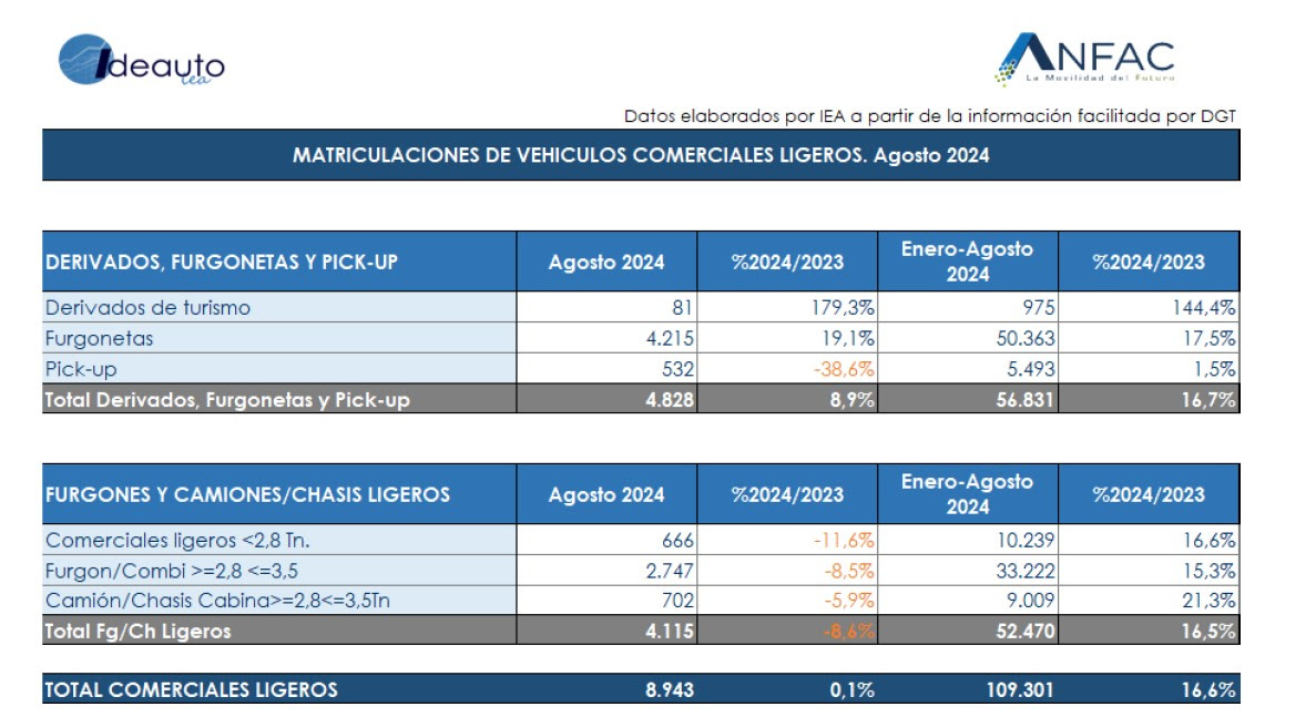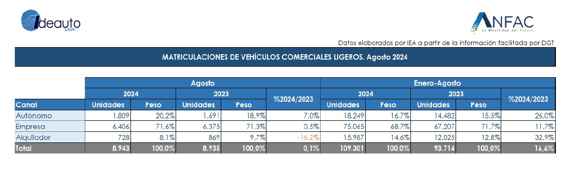 Las matriculaciones de vehículos comerciales ligeros se mantienen estables en agosto, con un leve aumento del 0,1% y 8.943 unidades vendidas. Hasta el octavo mes se han vendido un total de 109.301 vehículos, que supone un aumento del 16,6% respecto al mismo período del año anterior. En cuanto a las ventas por canales, tanto autónomo (+7%) como empresa (+0,5%) registran crecimientos, mientras que los alquiladores descienden un 16,2% en agosto.