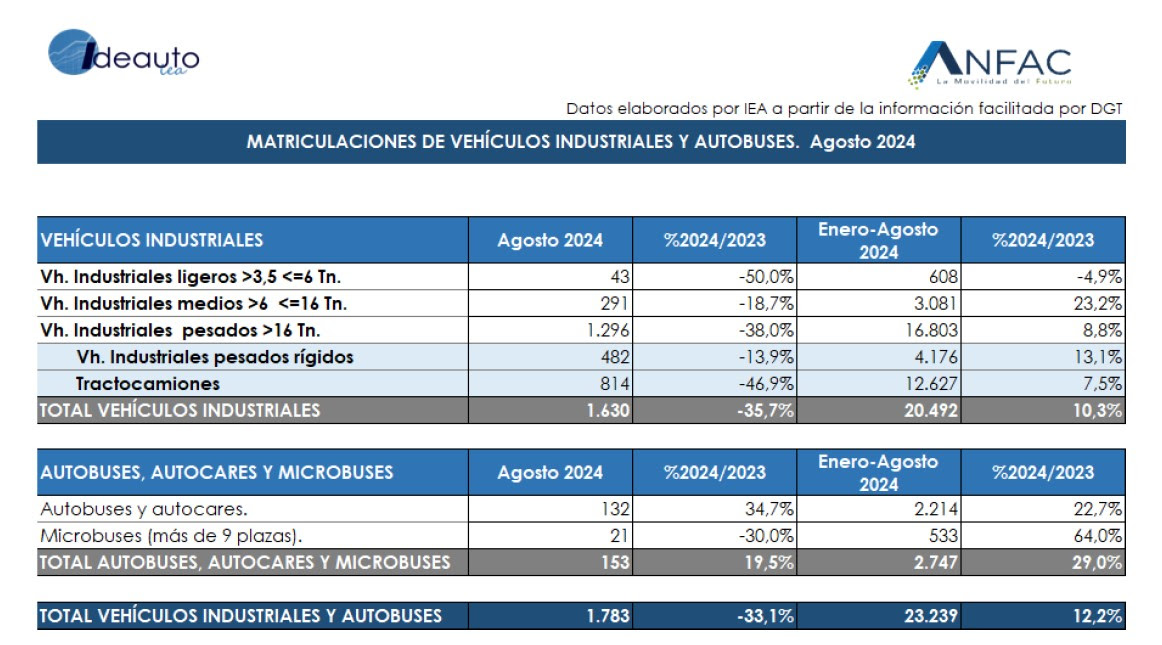 En agosto, las matriculaciones de vehículos industriales, autobuses, autocares y microbuses sufren un notable descenso del 33,1%, con 1.783 unidades. En el total del año, se acumulan 23.239 unidades, que supone un aumento del 12,2%. Por tipo de vehículos, en las ventas de industriales es donde se registra la mayor caída, con un descenso del 35,7% y 1.630 unidades. Mientras que el mercado de autobuses y autocares logra crecer un 19,5%, hasta las 153 ventas en el mes.