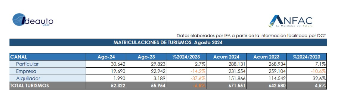 El mercado de turismos sufre un importante retroceso en el mes de agosto, con una caída del 6,5% y un total de 52.322 unidades. El octavo mes siempre viene marcado por el período vacacional del verano, lo cuál condiciona las ventas a la baja. Sin embargo, este agosto ha obtenido una peor cifra que el año anterior frenando el crecimiento anual, que con 671.551 nuevas matriculaciones se sitúa solamente un 4,5% por encima que en 2023. Asimismo, el mercado es todavía un 30% menor previo a la pandemia.