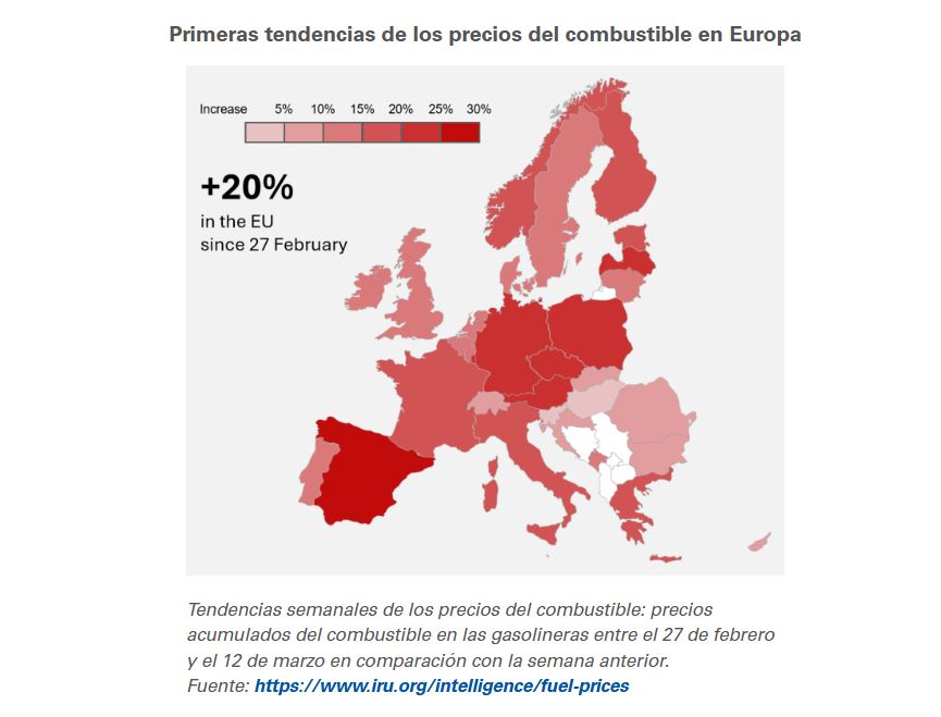 La UE también está experimentando un aumento significativo de precios. El promedio ponderado (basado en el consumo de los camiones) ha subido un 20 %. El diésel alcanza ahora un promedio de 2 euros por litro (impuestos incluidos). En el Reino Unido, los precios del diésel han aumentado un 13 % en las gasolineras.