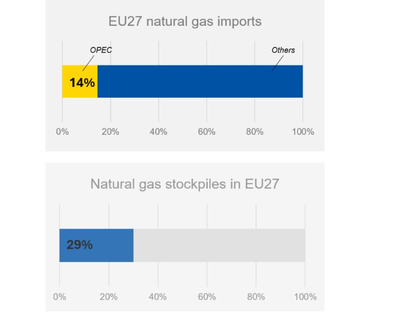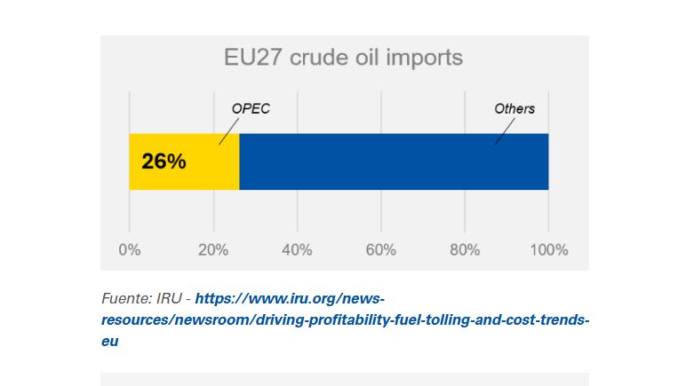 Los países de la OPEP suministran el 26 % del petróleo crudo que se consume en la UE y el 15 % del diésel para vehículos. Debido a las limitaciones en el estrecho de Ormuz, la mayor parte de la producción de la OPEP no se puede exportar, lo que afecta significativamente a los países asiáticos y, en menor medida, a la UE.