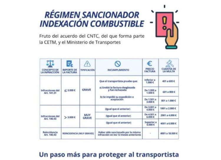 Por esto y con el objetivo de que las empresas y autónomos del transporte tengan conocimiento de estas medidas, en la CETM han creado dos infografías explicativas que pueden servir de apoyo a los transportistas para que apliquen la indexación del precio del gasóleo y como es el régimen sancionador para los cargadores que no lo apliquen el el pago de los transportes de mercancías por carretera.