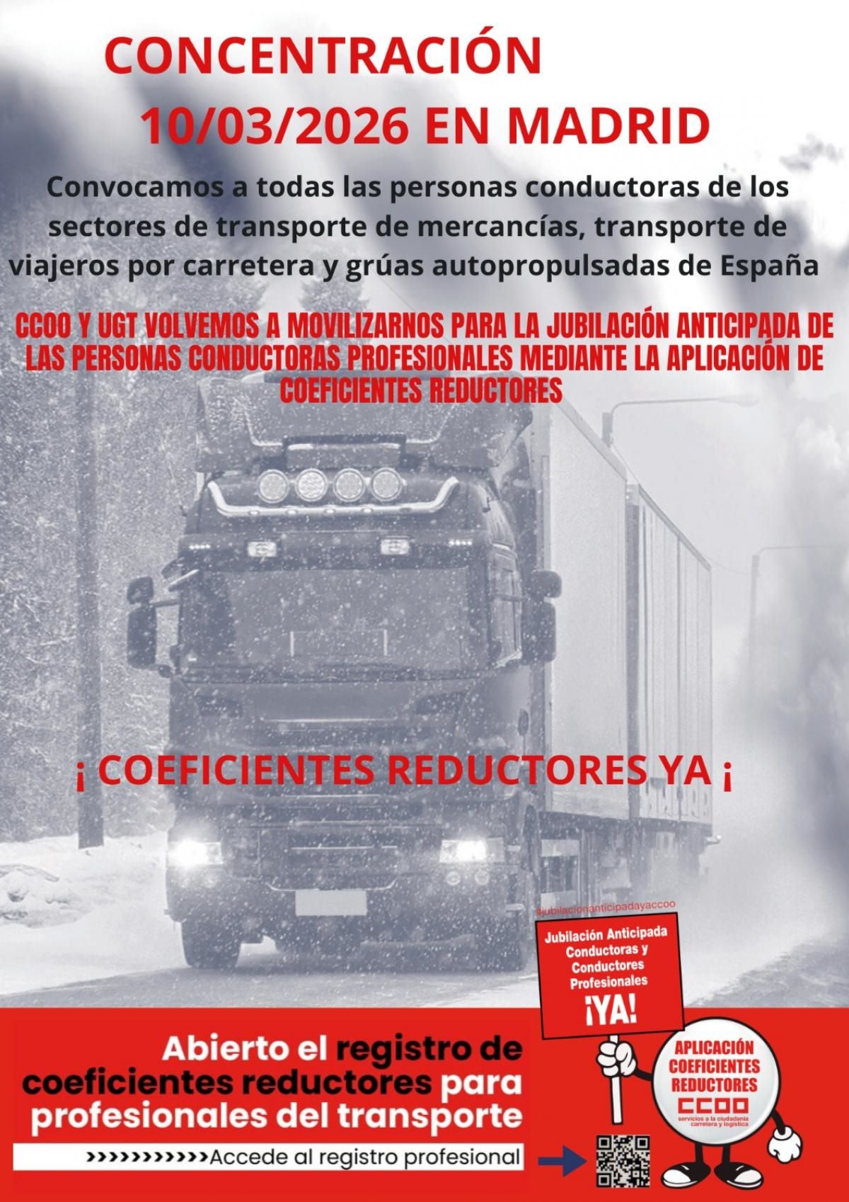 «Desde el sector estatal de carretera y logística de CCOO y el sector de carreteras, urbanos y logística de UGT convocamos a todas las personas conductoras de los sectores de transporte de mercancías, transporte de viajeros por carretera y grúas autopropulsadas de España a concentrarse el 10 de Marzo en Madrid para exigir la resolución favorable de las solicitudes presentadas el mes de Octubre de 2025 para el reconocimiento de coeficientes reductores que permitan el adelanto de la edad de jubilación del colectivo.