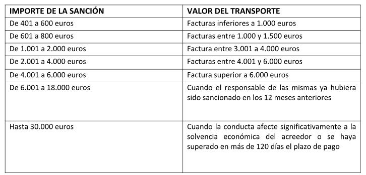 Se aplica un régimen de sanciones de carácter gradual en función del valor de la factura; reincidencia en la sanción; y puede verse agravada cuando la conducta afecte significativamente a la solvencia económica del transportista, como vemos a continuación: