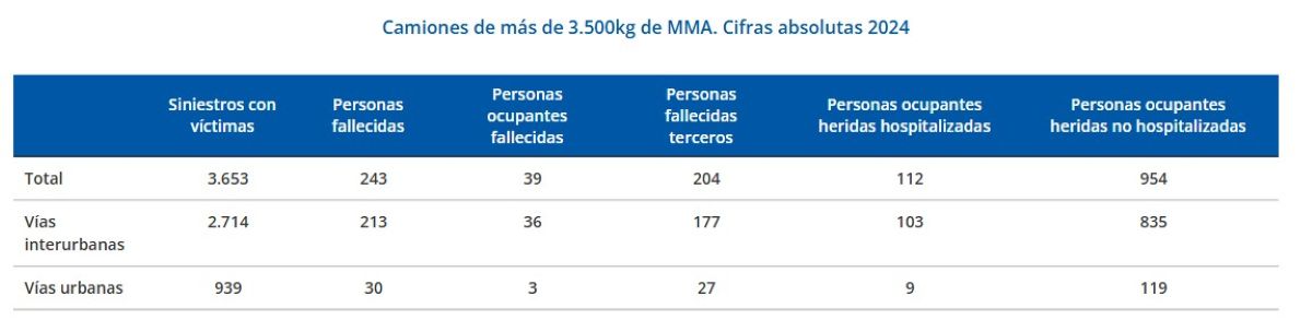 En España, la cifra de camiones de más de 3.500 kg de masa máxima autorizada que se vieron implicados en siniestros de tráfico creció en el año 2024 frente a 2023, pasando de 3.584 siniestros en 2023, a 3.653 siniestros en 2024, sucediendo mayoritariamente en vías interurbanas (74%), frente a los sucedidos en vías urbanas (26%). En 2024, un total de 39 personas usuarias de camiones de más de 3.500kg de MMA fallecieron, 16 menos que en 2019, mientras que los fallecidos en terceros ascendieron a 204.