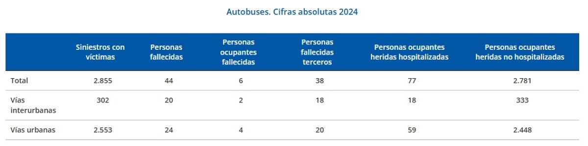 Por su parte, el número siniestros con autobuses implicados se incrementó en 2024 pasando de 2.662 siniestros en 2023 a 2.855 siniestros en 2024, sucediendo mayoritariamente en vías urbanas (89%), frente a los sucedidos en vías interurbanas (11%).