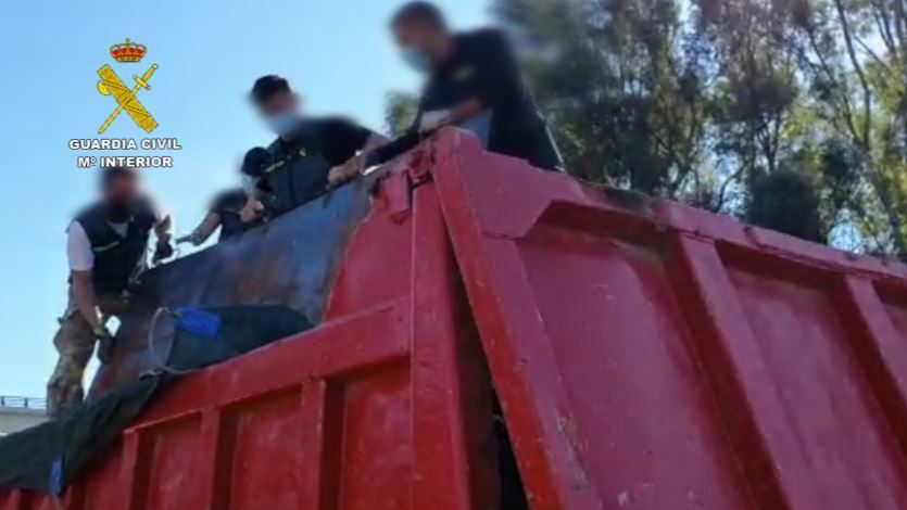 De la misma manera, el día 25 de enero los investigadores supieron que dos vehículos transportaban droga desde el Campo de Gibraltar hasta una nave ubicada en el polígono industrial de “La Trocha» de la localidad de Coín (Málaga). En el interior de esa nave se realizó un transbordo de la droga a un camión “bañera» de transporte de áridos. Cuando los investigadores interceptaron este camión hallaron, en un doble fondo practicado bajo la carga de arena que transportaba, otros 26 fardos de hachís.