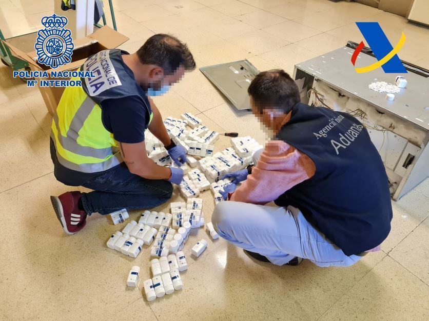Las gestiones policiales practicadas finalizaron con un dispositivo conjunto de la Policía Nacional y el Servicio de Vigilancia Aduanera de la Agencia Tributaria, cuyos agentes se personaron en el almacén de la empresa de transportes en Getafe (Madrid). Allí procedieron a la apertura del paquete, que contenía dos cajas con un horno en el interior de cada una de ellas. Al retirar el panel metálico de ambos hornos localizaron ocultos, en los compartimentos interiores, 348 botes de pastillas que contenían un total aproximado de 80.000 comprimidos. Los investigadores advirtieron que se estaba introduciendo la nueva droga mediante la apariencia de un conocido medicamento, aprovechándose tanto del envase como del etiquetado comercial. Además, la cantidad de comprimidos que alojaba cada uno de los envases intervenidos era cuatro veces mayor a la que comercialmente se lleva a cabo en la venta normal.