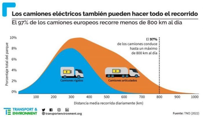 Los camiones eléctricos de mercancías igualarán a sus equivalentes diésel en términos de distancia recorrida, según el estudio de T&E. La mayor parte de los camiones de mercancías de Europa recorren menos de 800 km al día, una distancia que entra en el rango de autonomía de los camiones eléctricos de batería más nuevos, siempre que ésta se recargue durante los descansos que la ley impone a los conductores. En 2030, incluso los camiones eléctricos de largo recorrido más grandes podrán transportar el mismo peso de mercancías que los diésel, ya que el peso de la batería se compensa con la eliminación del motor de combustión y con las 2 toneladas adicionales permitidas para los vehículos de cero emisiones que contempla la normativa de la UE.