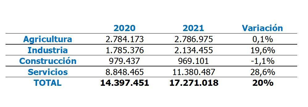 Por su parte, la industria también experimentó un crecimiento importante, del 19,6%, mientras que la agricultura solo creció una décima con respecto a 2020 y la construcción menguó un 1,1%.