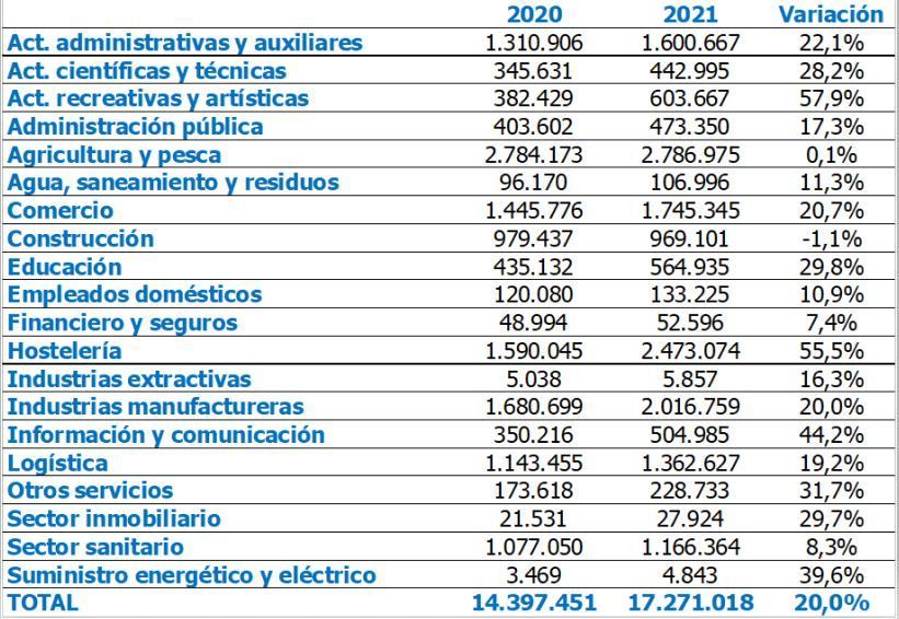 El número de contratos temporales ha crecido en todas las actividades económicas con respecto a 2020, excepto en las relacionadas con la construcción, que registra una caída del 1,1%.