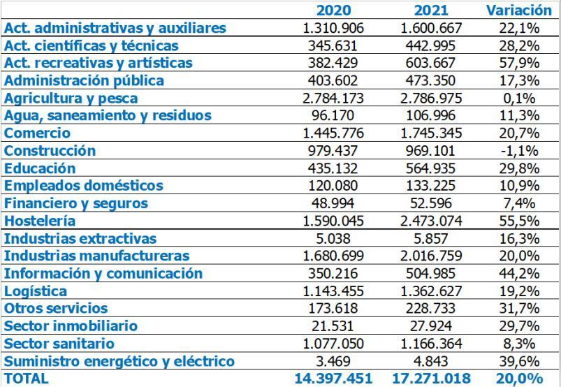 Randstad destaca que los incrementos más pronunciados se han producido en las actividades recreativas y artísticas (57,9%), la hostelería (55,5%), la información y la comunicación (44,2%) y el suministro energético y eléctrico (39,9%).