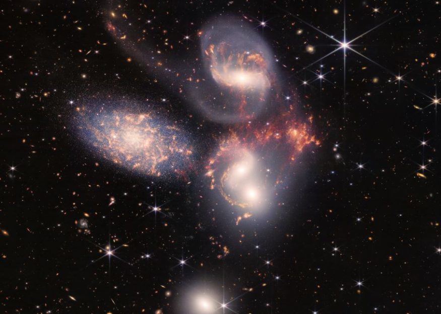 Stephan’s Quintet: Las estrellas proceden y contribuyen a la formación de las cantidades masivas de gas y polvo que se arremolinan alrededor de las galaxias. El polvo evoluciona con el tiempo y el Webb puede estudiar las galaxias cercanas que interactúan de forma dinámica para ver el polvo en acción. Ahora, la comunidad científica podrá ver, de forma poco común y con un grado de detalle sin precedentes, cómo las galaxias que interactúan entre sí provocan la formación de estrellas en cada una de ellas y cómo el gas de estas galaxias resulta alterado.