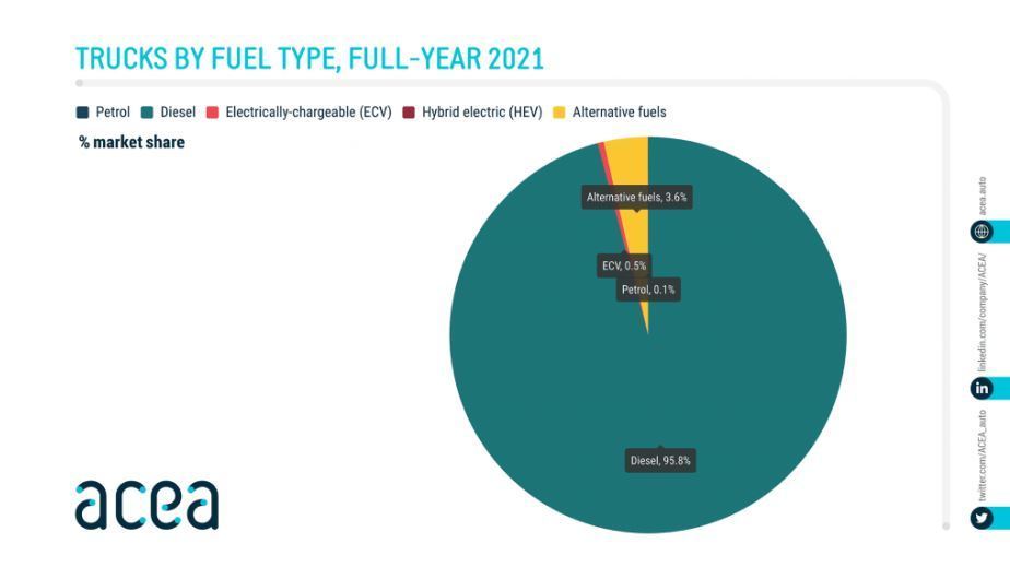 Redacción.- Durante el pasado año 2021, los vehículos con motores diésel siguieron dominando las ventas de vehículos comerciales medianos y pesados nuevos en la Unión Europea, representando el 95,8 % del mercado (96,5 % en 2020). Los vehículos con carga eléctrica representaron el 0,5 % de las ventas de camiones nuevos en la región (frente al 0,4 %), mientras que los vehículos de combustible alternativo tuvieron una participación de mercado del 3,6 % (en comparación con el 3,0 % en 2020).