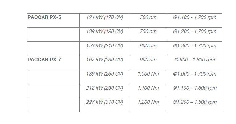 El motor PACCAR PX-5 de 4,5 litros viene con potencias desde 124 kW (170 hp) hasta 153 kW (210 hp) y el motor PACCAR PX-7 de 6,7 litros tiene potencias desde 167 kW (230 hp) hasta 227 kW (310 hp). ). Los motores desarrollan un par máximo incluso a velocidades más bajas, lo que permite la reducción de velocidad y, por lo tanto, una excelente eficiencia de combustible.