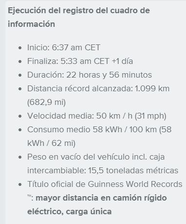 Los socios encontraron las mejores condiciones récord cerca de Hanover en el óvalo de alta velocidad en el Contidrom, el centro de pruebas interno de Continental. Es una pista de prueba ovalada de 2,8 kilómetros de largo. En total, dos conductores completaron 392 vueltas en turnos de 4.5 horas cada uno a una velocidad promedio de 50 km / h (31 mph), que es un valor promedio realista para el uso diario. Inicialmente, las condiciones climáticas no eran ideales con 14 grados (57 ° F) de temperatura exterior y solo alrededor de 23 grados (73 ° F) de temperatura del suelo. Además, el viento soplaba a un promedio de 18 km / h (11 mph) con ráfagas de hasta 40 km / h (25 mph). Sin embargo, después de poco menos de 23 horas, los socios pudieron declarar el título GUINNESS WORLD RECORDS de la distancia más larga recorrida por un camión eléctrico sin parada de carga con 1.099 kilómetros recorridos.