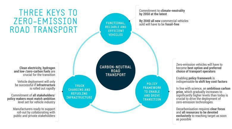 Los fabricantes ya están en camino de implementar estrategias para una rápida descarbonización del transporte por carretera. Esto requerirá un cambio fundamental en las tecnologías del tren motriz. Los vehículos de cero emisiones, es decir, los vehículos eléctricos a batería y los que funcionan con hidrógeno, deberán convertirse en la columna vertebral del transporte por carretera si el sector quiere alcanzar sus objetivos de descarbonización.