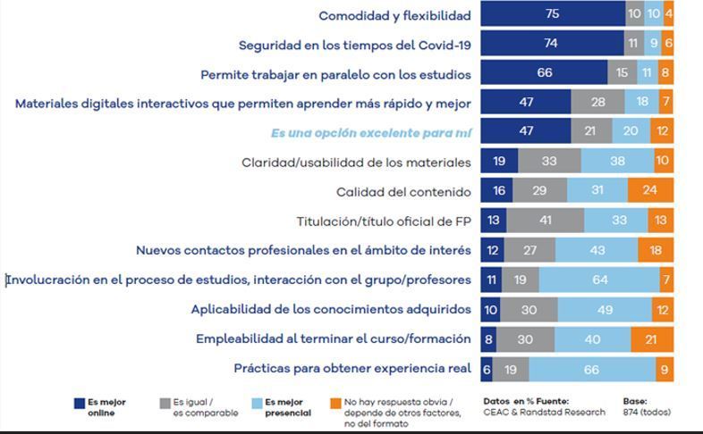 Las razones principales para las personas que consideran que la formación a distancia ha tenido un impacto muy positivo son las siguientes: la opción de haber podido aplicar a más vacantes, la posibilidad de cambiar su rumbo profesional y el haber encontrado un empleo, en ese orden. Con los cambios sociales que ha traído consigo la pandemia, el modelo a distancia gana al presencial en términos de comodidad, flexibilidad, seguridad para próximas epidemias o pandemias, la compatibilidad ya no solo con otros trabajos sino con la vida familiar y los materiales interactivos.