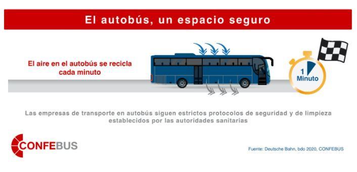 La renovación completa del aire del interior de los autobuses, que los sistemas de ventilación permiten que se realice entre 90 y 37 segundos, es lo que hace posible que la ocupación de los autobuses al 100 % no suponga un riesgo adicional de propagación del virus, con la salvaguarda importante que supone el uso obligatorio de mascarillas. La información a los viajeros es otra de las medidas implantadas por el 84,3 % de las empresas, junto con el uso de equipos de protección individual y la asignación de asientos fijos a los viajeros o la habilitación de separación entre trabajadores y viajeros, así como la implementación de sistemas para evitar las aglomeraciones en la subida y bajada de viajeros.