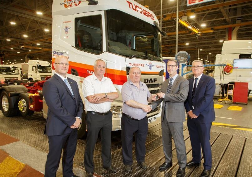 Redacción.- La empresa inglesa Turners (Soham) Ltd., especializada en transporte en camiones cisterna y mercancias refrigeradas de Cambridgeshire, ha recibido su tractora ligera de elevación media ‘FTP’ 6×2 número 1.000 de DAF Trucks. El vehículo número 1.000 es un DAF XF450 FTP de nueva generación y forma parte del último pedido de Turners de 69 unidades tractoras DAF XF.