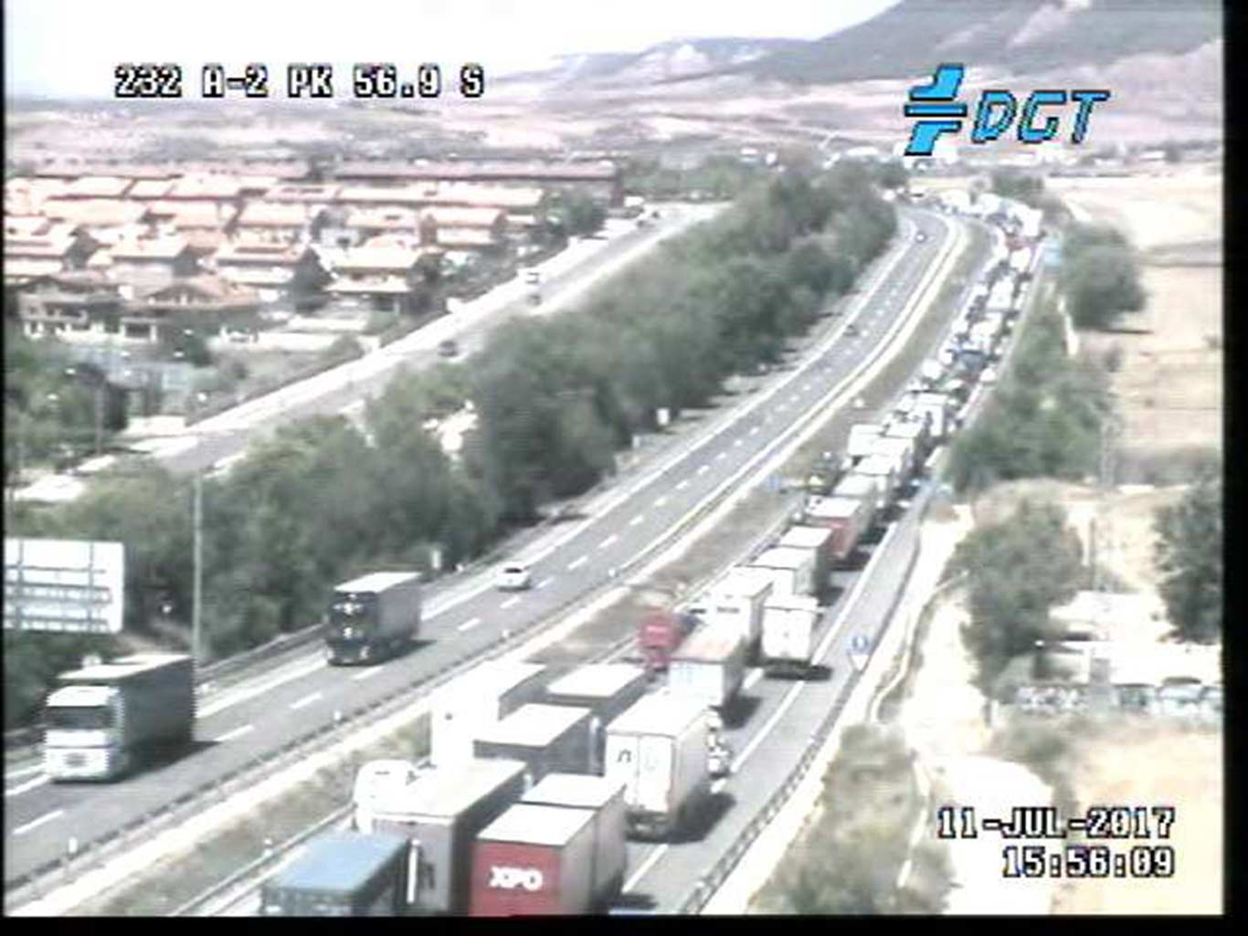 Hoy está siendo tarde muy complicada, con varios accidentes en los que se han visto implicados camiones. A esta hora en la A-2 sentido Zaragoza, hay más de diez kilómetros de atasco que provocan retenciones de más de una hora. La DGT informaba a las 15:00 horas en su cuenta oficial de Twitter de una kilométrica retención a la altura de la curva de Guadalajara hasta pasado Valdenoches que colapsaba la carretera A2 en dirección Zaragoza.