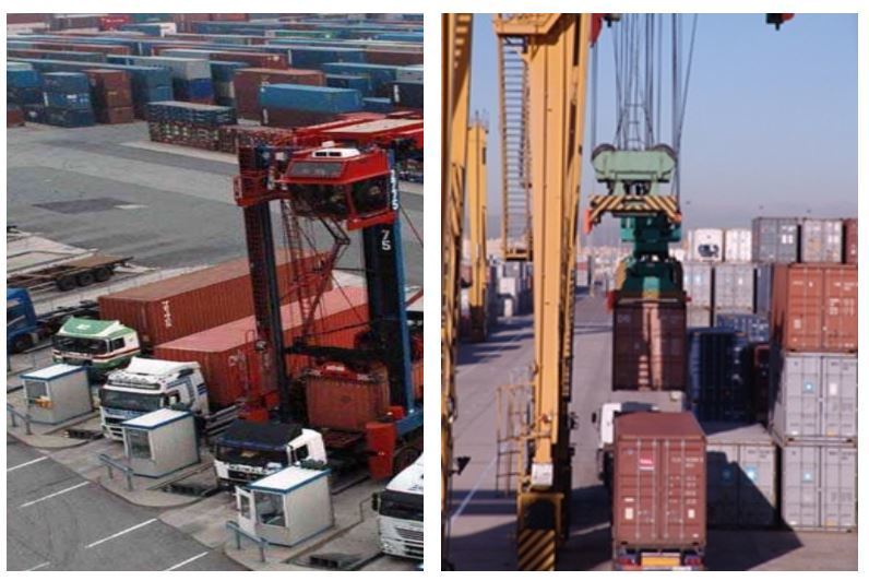 Dos métodos distintos de carga y descarga de los contenedores marítimos. La foto de la izquierda es donde el camión queda ubicado y el conductor fuera de la cabina en una garita sin peligro ninguno, la foto de la derecha es la operativa que realizan las tres terminales en el Puerto de Valencia, siendo que el camión queda ubicado en las pilas de contenedores pudiendo estar en numerosas ocasiones hasta cinco de altura, que el transtainer opera para poder coger el contenedores, y el conductor dentro de la cabina.