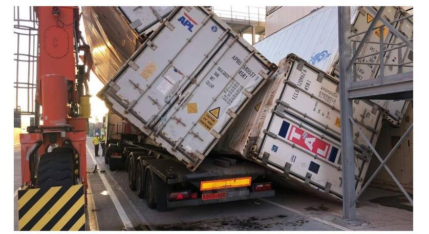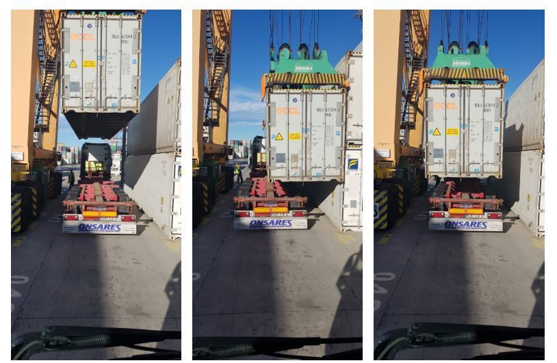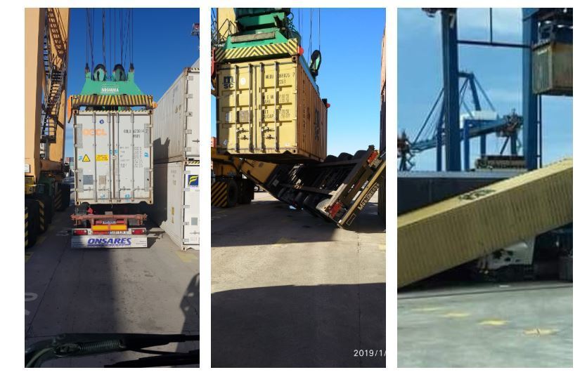 Esta es la operativa que realizan con carga suspendida la máquina llamada Transtainer, y las consecuencias que puede llevar a estas operaciones estando en las pilas de contenedores y el conductor dentro de la cabina.