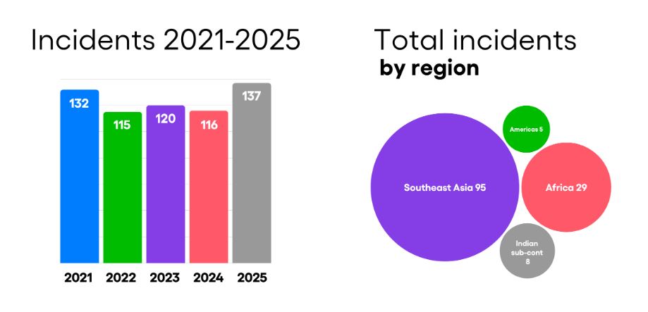 Según el Informe Anual sobre Piratería y Robo a Mano Armada de la OMI, en 2025 se registraron 137 incidentes contra buques, en comparación con 116 en 2024 y 120 en 2023. El informe revela que 121 buques fueron abordados, cuatro buques fueron secuestrados y dos fueron atacados a tiros, además de 10 intentos de ataque.