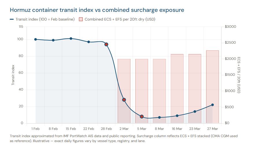 CMA CGM introdujo su recargo por combustible de emergencia el 16 de marzo a 150 dólares por TEU en las rutas de larga distancia, y lo revisó al alza a 265 dólares por TEU tan solo once días después. Maersk aplicó su recargo de emergencia por combustible a nivel mundial a partir del 25 de marzo, no solo en las rutas de Oriente Medio, sino en toda la red, basándose en que los costos de abastecimiento de combustible en toda la red se habían recalculado debido al evento. Hapag-Lloyd siguió una lógica similar, aplicando $160 por TEU en los vuelos de ida a partir del 23 de marzo.