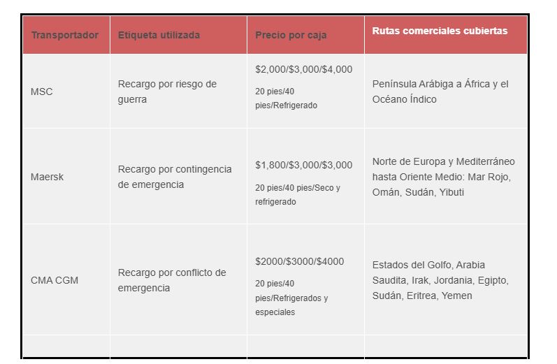 El efecto acumulativo en un solo contenedor seco de 40 pies que se mueve en una ruta de larga distancia, una vez que se suman el flete base, el recargo por conflicto y la prima de combustible, eleva el costo total de aproximadamente $1,800 antes de la crisis a algo más de $5,000 en la mayoría de las principales navieras.